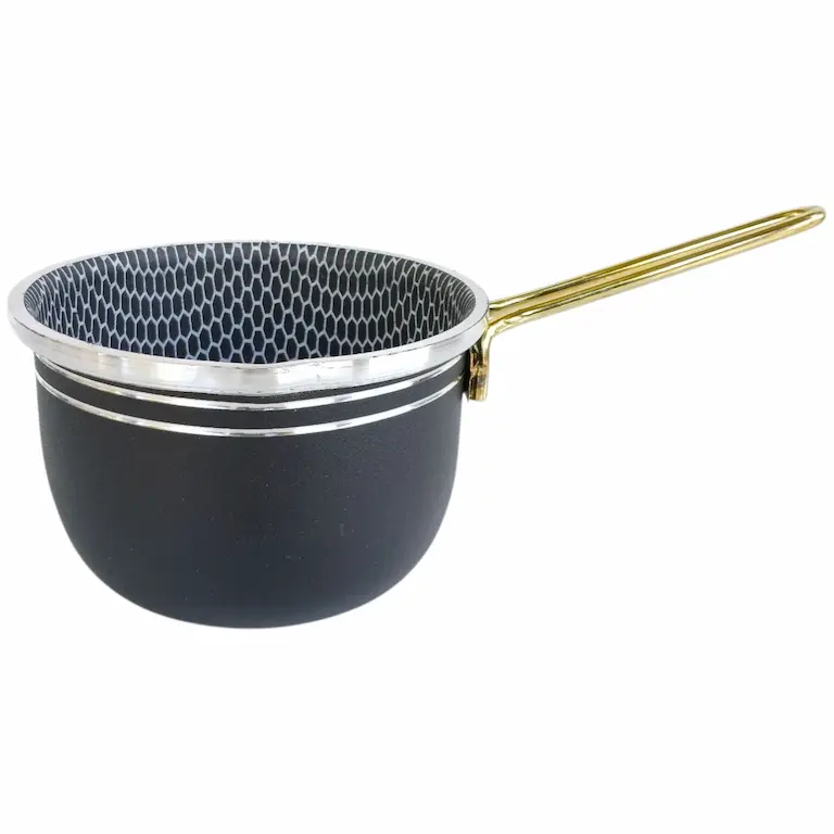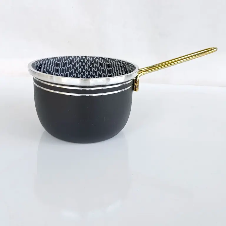 این شیر جوش دسته طلایی طرح چدن گرانیتی است که برای استفاده روزانه مناسب است و جنس بدنه از آلومینیوم و پوشش داخلی ظرف با گرانیت نچسب طرح لانه زنبوری پوشش داده شده است. شیر جوش دسته طلایی به صورتی طراحی شده که لبه های آن بیشترین ضخامت ممکن را دارا می باشد و در نتیجه از استحکام بالایی برخوردار است. این شیرجوش دارای یک دستگیره ی مقاوم فلزی بلند به رنگ طلایی است. قطر داخلی این محصول 14 سانتی متر می باشد و در صورت نیاز به استفاده از درب، میتوانید از درب پیرکس با سایز 14 استفاده نمایید.