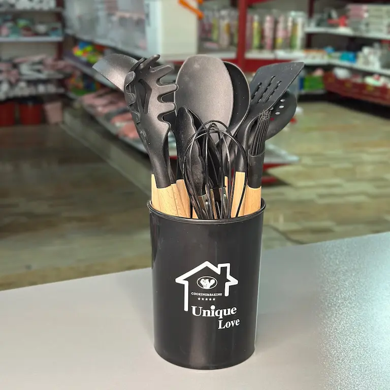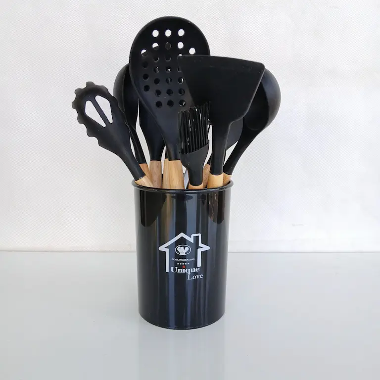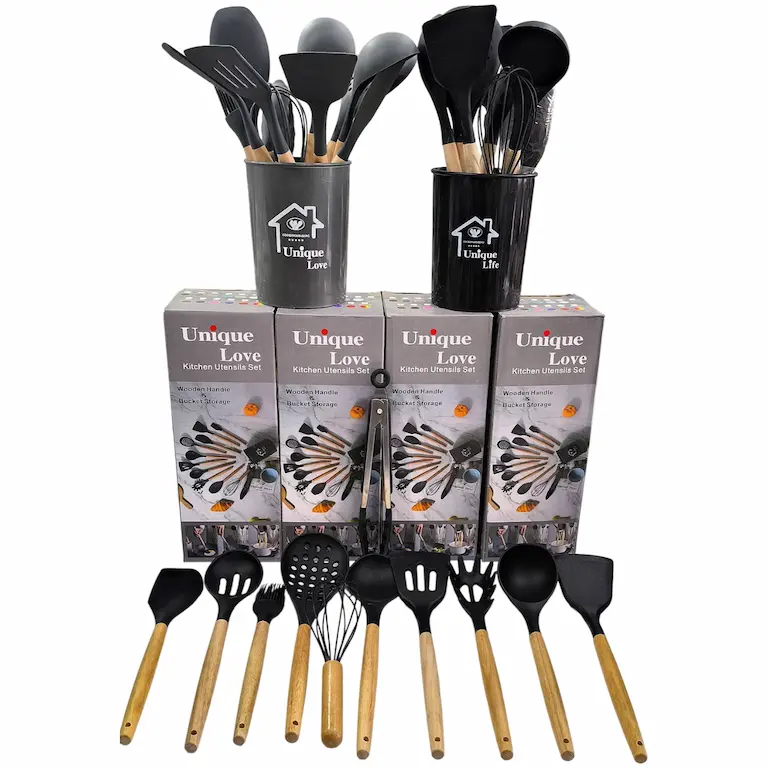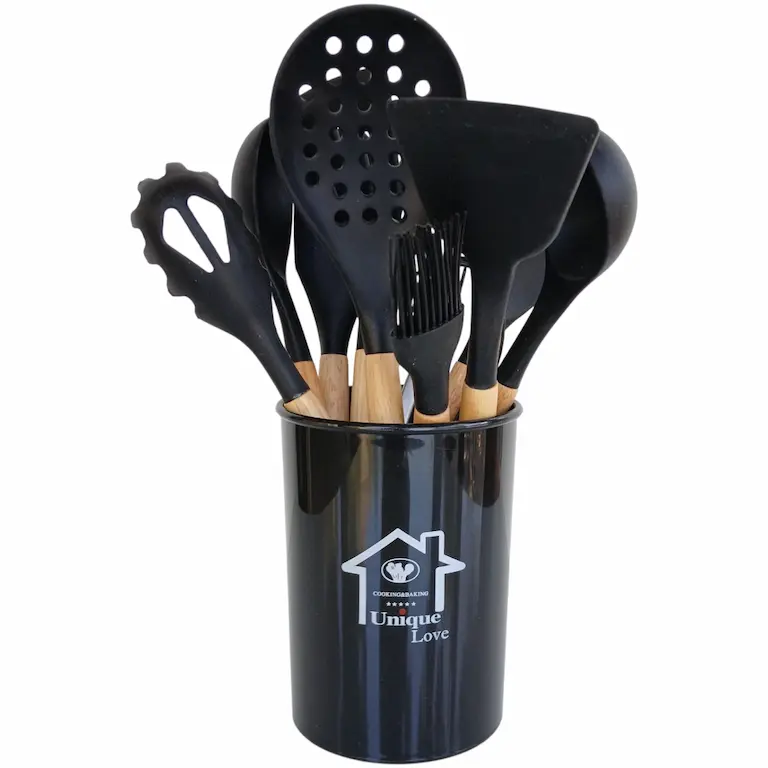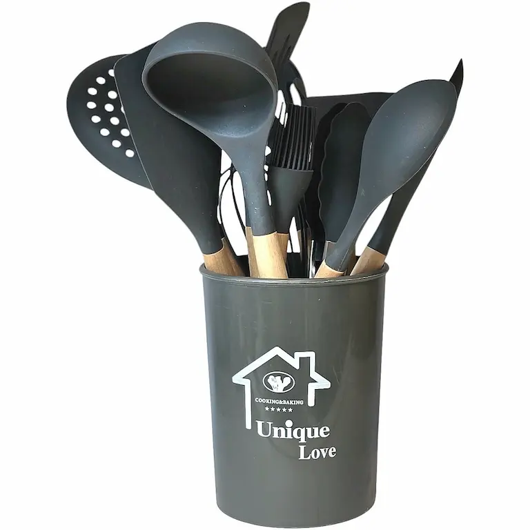 ست کفگیر و ملاقه 12 پارچه یونیک لاو Unique Love ساخته شده از با کیفیت ترین مواد سیلیکون با استاندارد FDA و بدون BPM، دسته های چوبی از جنس بامبو و یک ظرف نگهدارنده از جنس پلاستیک می باشد. این سرویس از وزن متعادل و دیزاین منحصربفردی برخوردار است که باعث می شود در دست گرفتن آن آسان و پخت و پز را راحت کند. سیلیکون به کار رفته در این محصول ساخته شده از مواد غیر سمی، بی بو و سازگار با محیط زیست است. این سرویس در برابر درجه حرارت سرما تا 30- و گرما 230+ درجه سانتی گراد مقاومت دارد. انعطاف پذیری، رویه های نرم از خراشیدن و آسیب رساندن به ظروف شما جلوگیری می کند و همچنین باعث کاهش سر و صدا هنگام آشپزی می شود توجه داشته باشید که انبر به علت نوع کاربریش از سیلیکون نرم نمی باشد و جنس سفت تری دارد تا به هنگام استفاده ایجاد مشکل نکند. این مجموعه متشکل از 11 عدد کفگیرملاقه با کاربردهای مختلف و 1 عدد ظرف نگهداره می باشد.