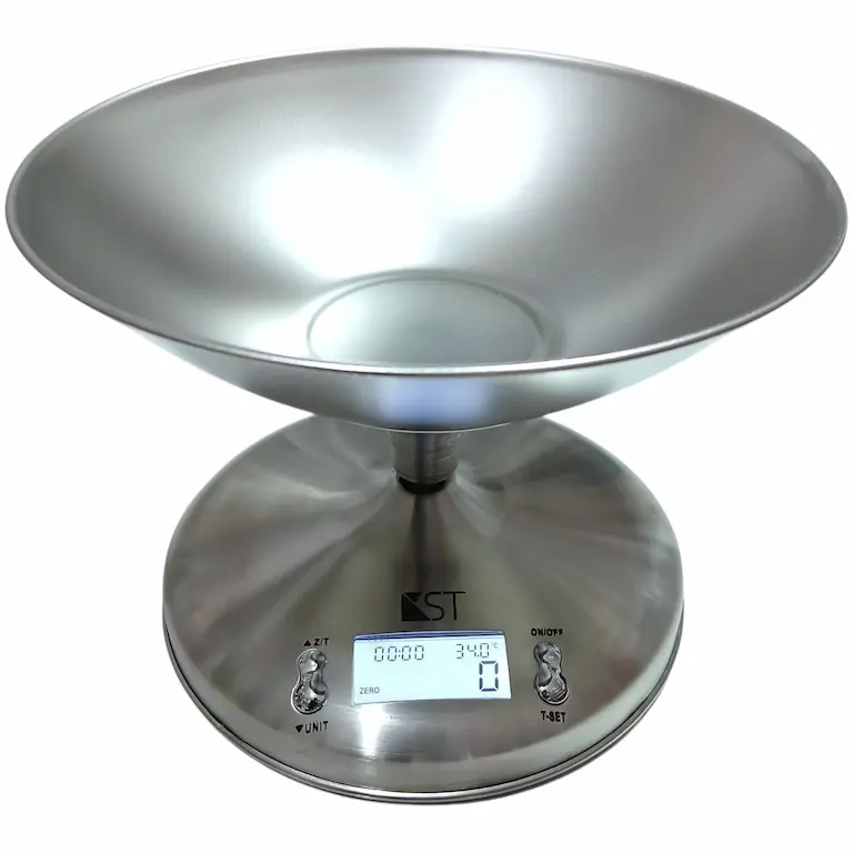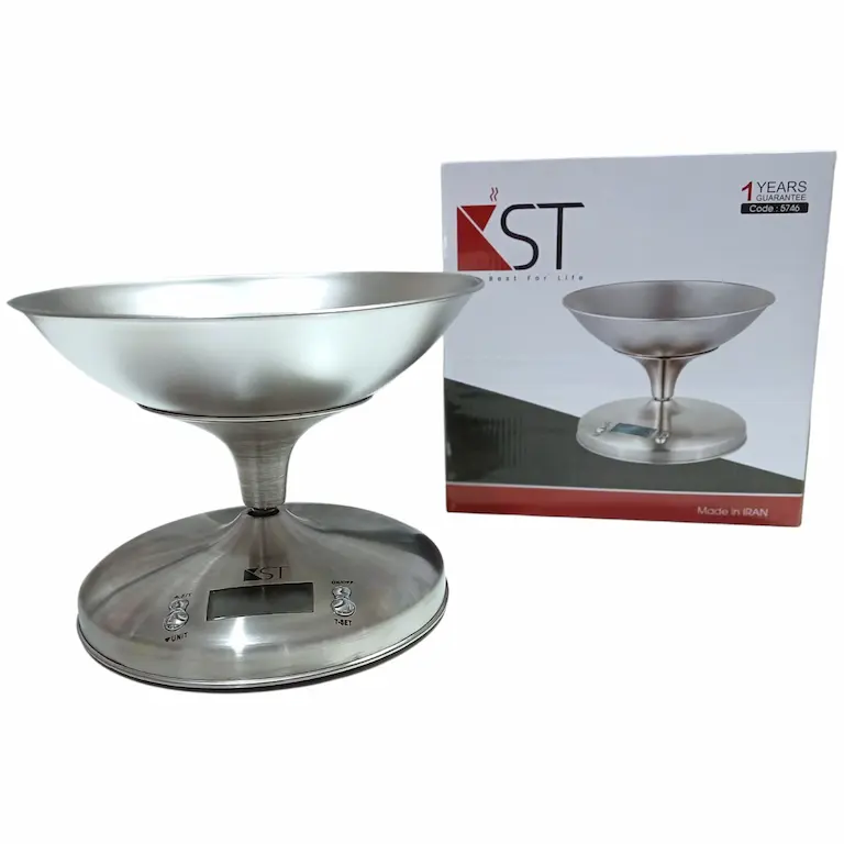 ترازو آشپزخانه کی اس تی مدل 5746 کاسه دار استیل معروف به ترازو گیلاسی یک ترازوی دیجیتال دقیق با ظرفیت 5 کیلوگرم و دقت 1 گرم است که با طراحی شیک و نمایشگر LCD خوانا، انتخابی عالی برای آشپزی حرفهای و خانگی محسوب میشود. این ترازو با طراحی مدرن و سطحی از جنس استیل، علاوه بر دقت بالا، زیبایی خاصی به آشپزخانه شما میبخشد. ترازو گیلاسی KST با قابلیت Tare میتواند وزن ظرف را نادیده بگیرد و وزن خالص مواد را بهراحتی با واحدهای گرم و اونس اندازهگیری کند.