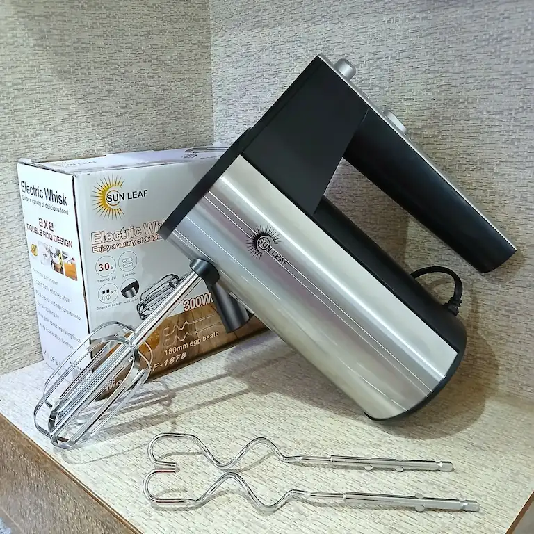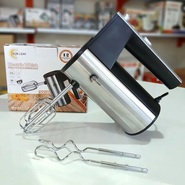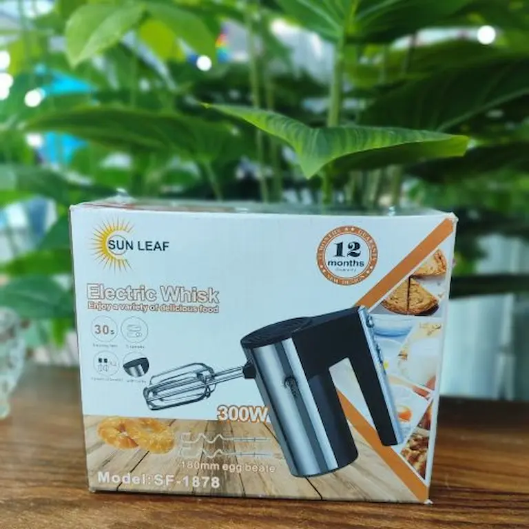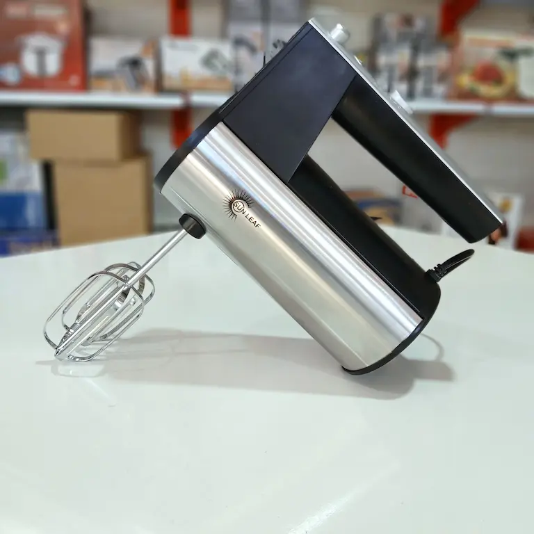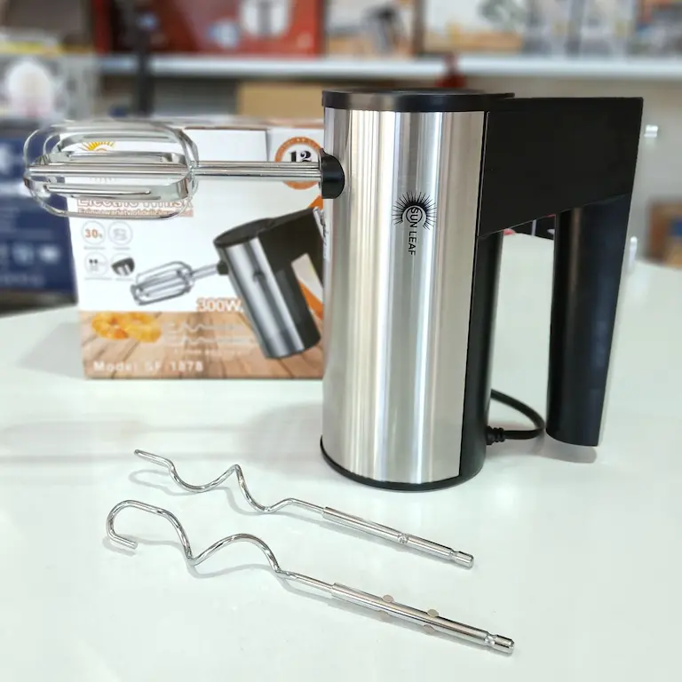همزن برقی سان لیف مدل SF-1887 با استفاده از برق مستقیم کار می‌کند و با توان 300 واتی که دارد برای هم زدن شدید، مخلوط کردن یا یکنواخت کردن غلظت مواد مخلوط شده استفاده می‌شود. با کمک همزن SUN LEAF می‌توانید انواع مواد مانند خمیر، تخم مرغ، مواد تشکیل دهنده نان، شیرینی و… را در کمترین زمان آماده کنید. همزن سان لیف دارای بدنه استیل و پلاستیک، موتور 5 سرعته، دکمه توربو، قلاب های استیل ضدزنگ مخصوص همزن و خمیر زن و دکمه اجکت مخصوص خارج کردن آسان میله ها است.