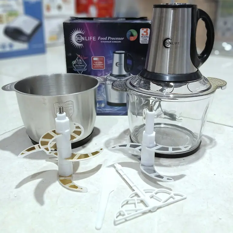 خردکن دو کاسه سان لایف مدل SL-914PLUS دارای موتور 3 سرعته با توان مصرفی 1800 وات و دو کاسه از جنس پیرکس و استیل با ظرفیت 3.3 لیتر میباشد. خردکن SUN LIFE دارای یک تیغه 6 پره استیل طلایی و یک تیغه 4 پره استیل نقره ای ضد زنگ با محافظ تیغه است. از قابلیتهای خردکن سان لایف میتوان به خرد کردن انواع سیب زمینی و پیاز، انواع حبوبات، خشکبار مانند گردو و بادام و پسته، سبزیجات مانند هویچ و فلفل، پروتئینها مانند گوشت مرغ و ماهی و… اشاره کرد. همچنین این خردکن برقی دارای دسته برای جابه جایی، واشر لرزش گیر برای زیر کاسه، شفت فلزی محل اتصال موتور و تیغه، کاردک تمیز کننده و پره مخصوص همزن مواد است.
